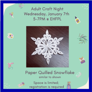 Join us at EHFPL on Wednesday, January 7 from 5-7PM to try paper quilling at our adult craft night! All materials are provided, but space is limited, so please RSVP on the library calendar.