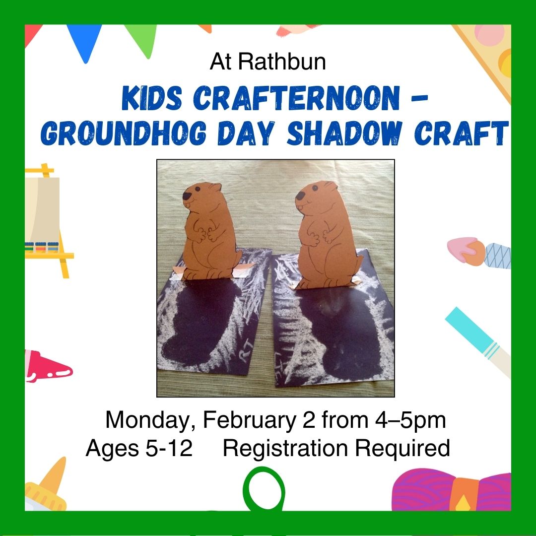 Featured February 2 @ 4:00 pm - 5:00 pm Kids Crafternoon – Groundhog Day Shadow Craft Join us for Kids Crafternoon, where we'll make a Groundhog Day Shadow Craft. No registration required. We hope to see you there! Rec. for ages 3+